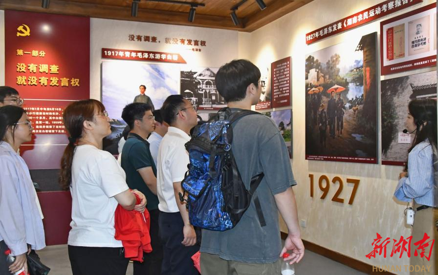 随后,师生正式抵达白箬铺镇龙莲村。“1917年,青年毛泽东和好友萧子升不带分文启程游学,白箬铺镇是他们调研的第一站”,研学向导的开场白一瞬间就将师生思绪激起涟漪。循着伟人游学足迹,走过虎踞亭、立志书院、幸福书院、调查研究主题展馆和白箬铺茶馆等景点,伴随着向导声情并茂的讲解,青年毛泽东的社会调查之路愈发清晰立体。师生深入学习体悟“没有调查,就没有发言权”的深刻内涵及老一辈革命家始终坚持深入实际亲身调研的求真务实作风与精神。