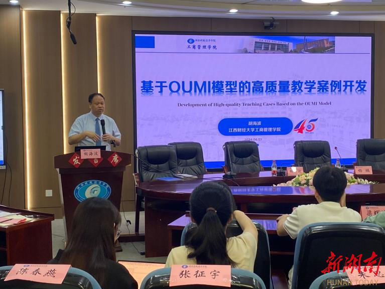 6月7日下午,beat365中文在线官网工商管理学院在主校区办公楼五楼视频会议室举办第十三期商学论坛。江西财经大学工商管理学院院长胡海波以“基于OUMI模型的高质量教学案例开发”为主题作辅导报告。论坛由工商管理学院院长杨鹏主持,副院长梁辉煌,科研办、学科办主任,专业教师代表及学生代表参加。