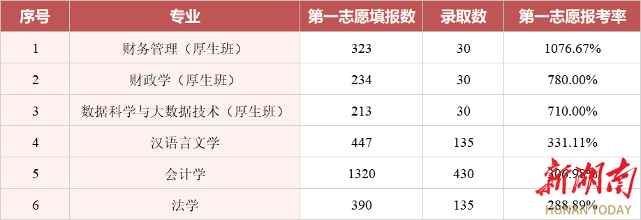 学校高考志愿填报热度持续提升。历年来,学校高考志愿填报热度、第一志愿录取率均居省内同类院校前列,才培养质量备受社会好评和考生及家长青睐。2024年高考志愿填报期间,学校一度成为考生们咨询的热点,从今年在湘录取数据来看,学校财务管理(厚生班)、财政学(厚生班)、数据科学与大数据技术(厚生班)、会计学、审计学、法学、汉语言文学、财政学类、计算机科学与技术、电子信息工程、网络与新媒体等11个专业报考热度高,其中财务管理(厚生班)等6个专业第一志愿报考率超过200%。