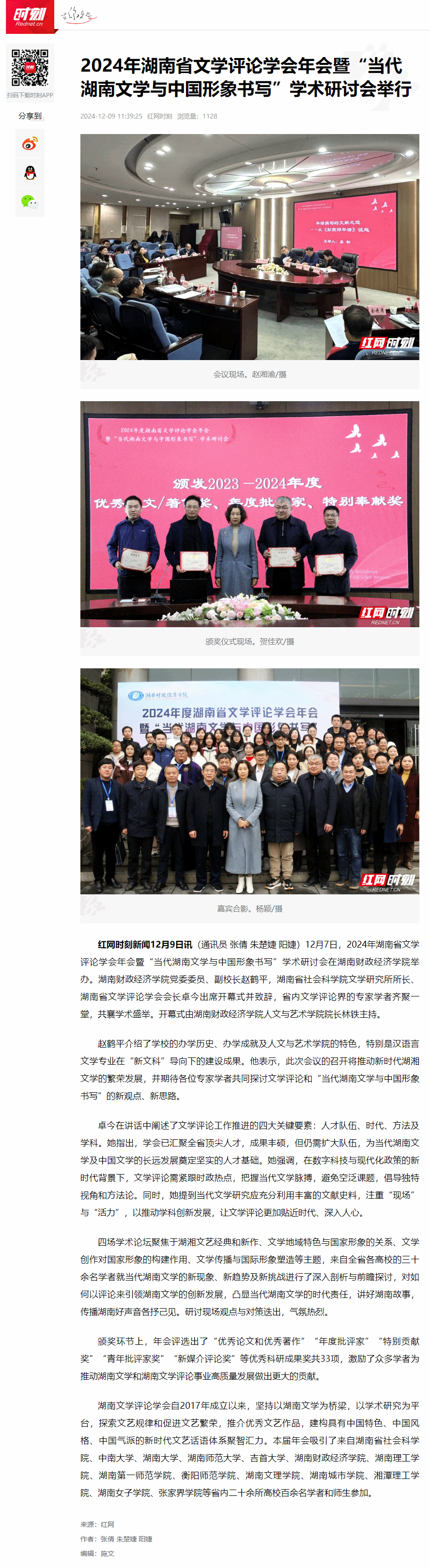 红网、华声在线:2024年湖南省文学评论学会年会暨“当代湖南文学与中国形象书写”学术研讨会在beat365中文在线官网举办
