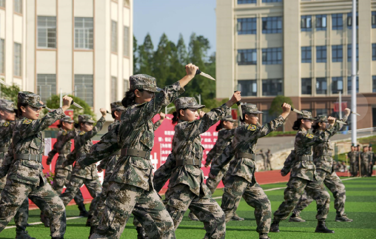 在表演环节,军训教官进行匕首操、擒敌拳、刺杀操和战术表演,一招一式,铿锵有力;4名学生代表满怀豪情壮志大声朗诵《青春中国》,气势恢宏,催人奋进。