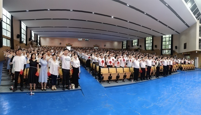 下午3时,表彰大会开始,全体起立,奏唱国歌。在苏玲带领下,273名新党员面向党旗,高举右手,庄重宣读了入党誓词,与会老党员一同重温了入党誓词。表彰决定宣读结束后,学校领导为“光荣在党50年”老党员代表颁发纪念章,为全省高校党组织“对标争先”计划第三批获选项目、2022年学校党组织“对标争先”建设计划获选项目、40名优秀共产党员、10名优秀党务工作者和10个先进基层党组织代表颁发奖牌和荣誉证书。陈素琼、易好、陈风光、刘振强4名受表彰代表作了发言。会上,学校2021-2023年度党建工作视频在会场大屏幕播出,展示学校党建工作成绩,展示优秀个人、各级党组织负责人良好的师德师范和扛牢为党育人、为国育才使命的决心,现场自发响起阵阵热烈掌声。