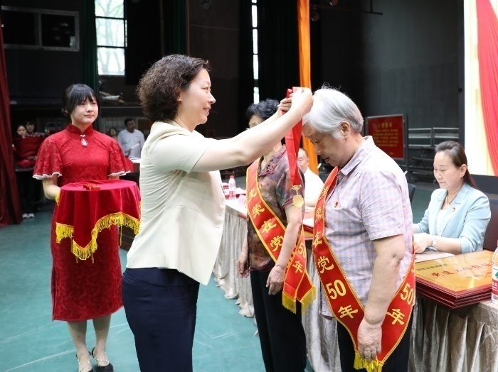 杨兰英为“光荣在党50年”老党员代表颁发纪念章 何妍/摄