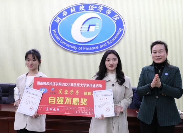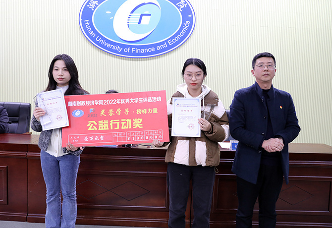团委书记刘天浩介绍了“芙蓉学子·榜样力量”优秀大学生评选活动的基本情况,并宣读了表彰决定。本次“芙蓉学子·榜样力量”优秀大学生评选活动共设5个奖项,评选出10名获奖人(团队):数学与统计学院学生敖姝、法学与公共管理学院学生叶婷获“芙蓉学子·道德风尚奖”;会计学院学生徐梓超、人文与艺术学院学生喻芳获“芙蓉学子·自强不息奖”;校青年志愿者协会、走读湘江低碳联盟获“芙蓉学子·公益行动奖”;辈幸福团队、会计学院学生谌洁茜获“芙蓉学子·学术科研奖”;繁星支教队、人文与艺术学院学生彭帆获“芙蓉学子·社会实践奖。”