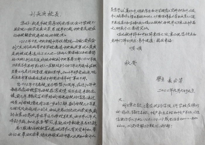 捐款前,袁老手写了一封情深意切的信给校长刘长庚,并随信附赠了他在母校求学时的一些资料以及他编著的书籍、字幅。袁老在信中表示,在这离校的70年中,每每思念母校当年恩、窗友情,历历在目,未能忘怀。几十年来,母校发生了翻天覆地的变化,他作为校友由衷感到高兴。