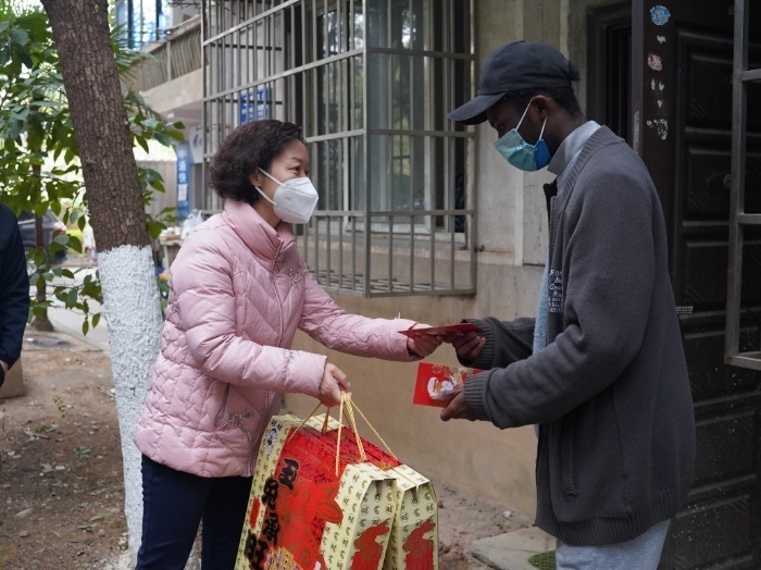 杨兰英(左)慰问主校区留校外籍学生 罗嘉怡/摄