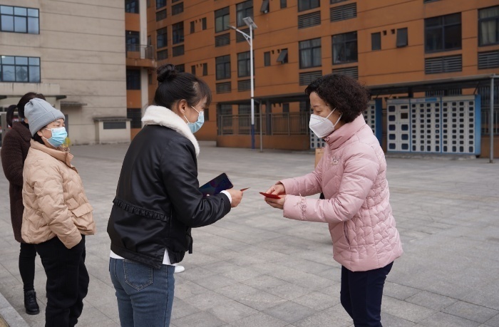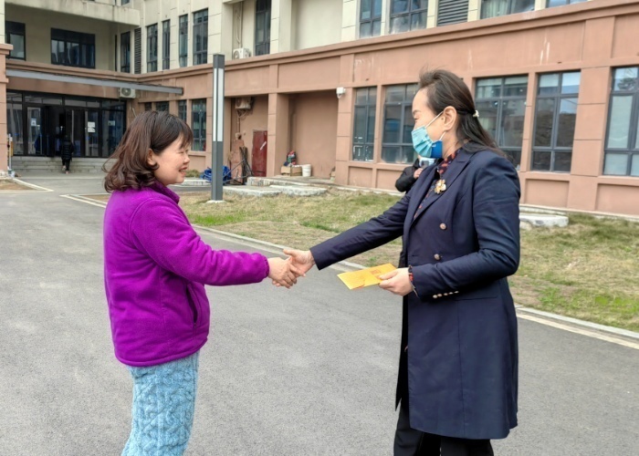 杨兰英(右一)为主校区在岗员工送上慰问金 罗嘉怡/摄