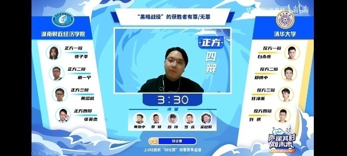 11月27日,半决赛正式打响,学校和清华大学围绕辩题,展开唇枪舌战。张英杰作为我方四辩畅谈“辩论的黑暗森林法则”,呼吁所有辩手放下“辩论猜疑链”,打破“黑暗森林法则”,此举不仅得到了对手的尊重与认可,也获得了评委与观众的一致好评。最终,学校辩论队以5:10惜败清华大学辩论队,但校辩论队成员的精彩表现给观众留下了深刻印象。