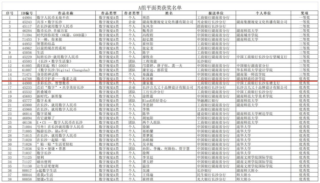 本次大赛是长沙首个以全民各阶层、各年龄段为参与对象,以科普宣传为手段,以提升大众对数字人民币的了解和使用为目的,以推动数字强省建设为目标的公益性赛事。大赛自9月16日启动以来,共征集到平面类、影像类、空间类参赛作品近2000件,各类作品评选一等奖2项。学校人文与艺术学院肖雅琼老师指导的网络与新媒体专业学生肖文烨、周宇、兰响的作品《哪一颗星能代表长沙》夺得影像类一等奖,并获奖金2.44万元;何昱老师指导的网络与新媒体专业学生袁凤麟、谌泽宇、杨驰宇、李洋洋、杨好的作品《世界,触手可及》获得影像类三等奖,并获奖金0.66万元;刘瑾老师指导的文化产业管理专业杜冰雁的作品《数币守护者--像素之战》获平面类优秀奖,并获奖金0.1万元。