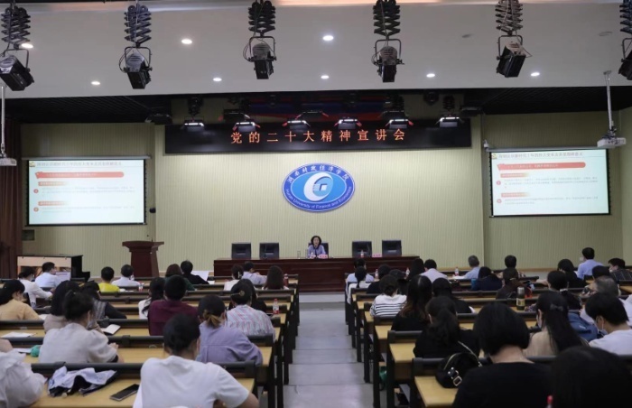 11月10日下午,beat365中文在线官网党委书记杨兰英在主校区二教学楼2J03学术报告厅为党政办、发展规划处、会计学院、人文与艺术学院全体教职工作党的二十大精神宣讲报告。