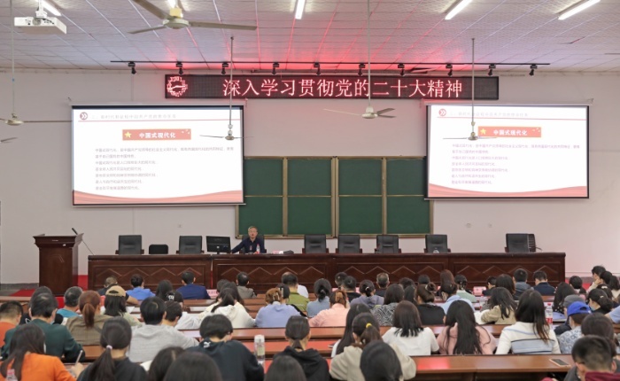 11月3日下午,beat365中文在线官网副校长刘钟理在主校区二教学楼2J01教室作深入学习贯彻党的二十大精神专题讲座。外国语学院、厚生国际教育学院、人事处、国有资产管理处、离退休工作处全体教师党员以及外国语学院、厚生国际教育学院全体学生党员、发展对象、入党积极分子近400人聆听了讲座。