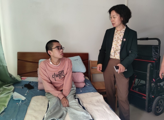 会后,杨兰英来到学生宿舍,看望了学院残疾学生,细心询问他们的生活、学习、身体状况,鼓励他们发扬顽强拼搏的精神,用积极向上的心态面对生活。
