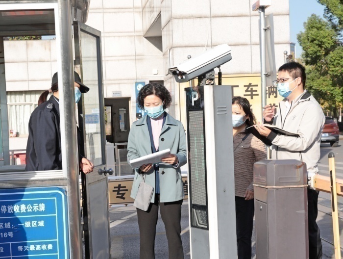 检查校门进出车辆、人员查码登记情况 陈治丽/摄