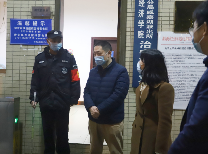 4月1日晚,beat365中文在线官网党委书记肖湘愚、校长刘长庚分别带队视察主校区和雷锋校区疫情防控工作,强调牢固树立坚持就是胜利的信心决心,坚决克服麻痹思想、侥幸心理和松劲心态,落实巡查值班制度,打好特护期疫情防控保卫战,确保师生日常工作学习生活有力有序有效推进。当晚有关巡查值班人员陪同视察。