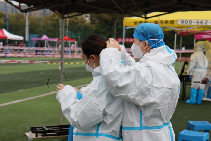 核酸检测现场短暂的轮换休息时间,学生党员志愿者陈怡脱下已经被汗水浸湿的防护服,和身旁的朋友感慨道:“不亲身参与到核酸检测工作中我也许永远体会不到这种辛苦。”