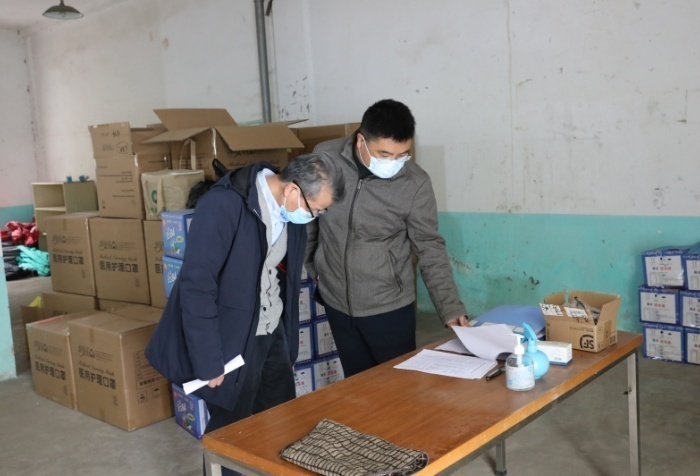 督导组成员查看防疫物资台账