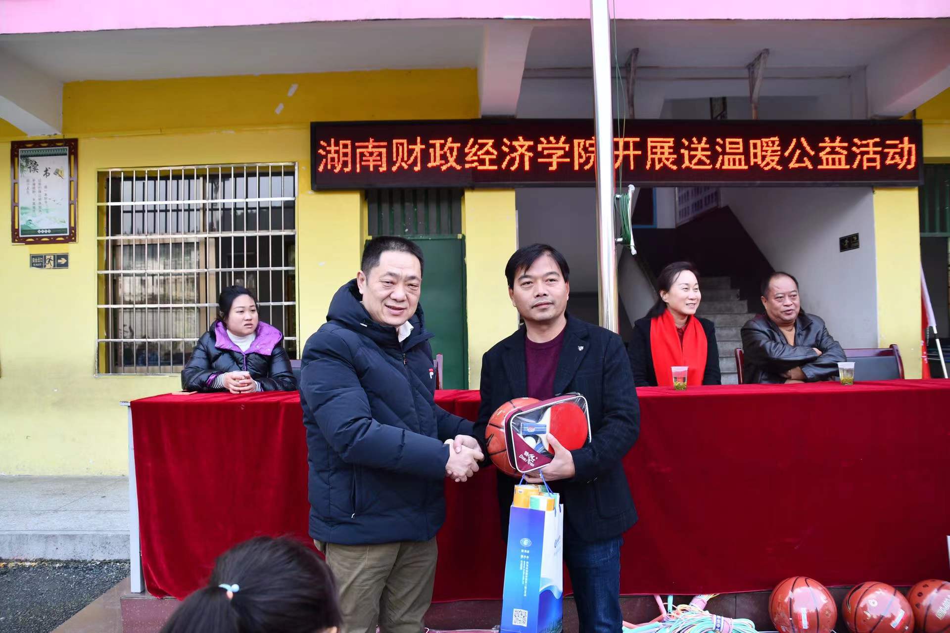 1月11日,beat365中文在线官网党委书记肖湘愚、副校长苏玲一行赴常宁市塔山瑶族乡狮园完小,将一批由雷锋学院全体学生亲手编织的红围巾和体育用品送到该校学生手中,让他们在寒冷的冬天感受到融融暖意。