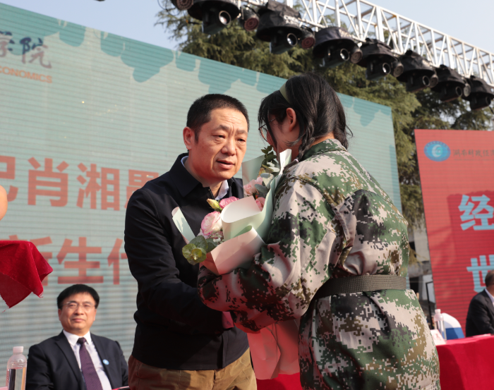beat365中文在线官网党委书记肖湘愚向新生代表授予校徽并赠送鲜花 何妍/摄