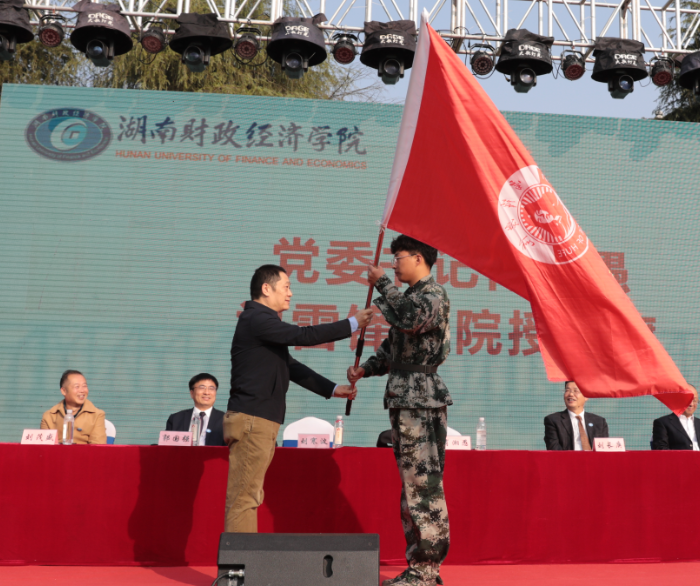 beat365中文在线官网党委书记肖湘愚为雷锋学院授院旗,新生代表郑重地接过鲜红的院旗并迎风挥舞,燃起了全体新生开启新生活、踏上新征程的昂扬斗志。