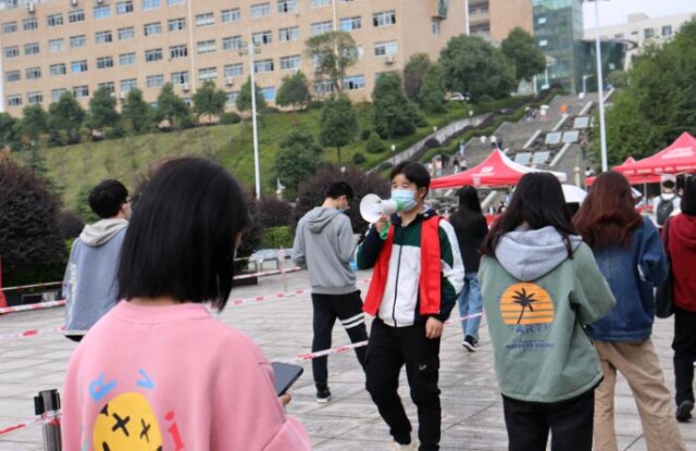25日下午,志愿者与医护人员相互配合,顺利完成检测现场布置工作。26日清晨7时,志愿者在检测现场集合,配合医护人员对前来做核酸检测的师生测量体温、排队引导、信息登记、现场消毒等工作。“请在入口处领取口罩,带好口罩,保持一米安全距离。”“您的信息登记已经完成,您可以直接做咽拭子检测了。”他们有的手拿扩音器维护秩序、有的带队引导、有的对样本存放区消毒……志愿者们勤勤恳恳服务于各个岗位,确保核酸检测工作高效、有序进行,那一抹抹志愿红成为了湖财最暖心的颜色。