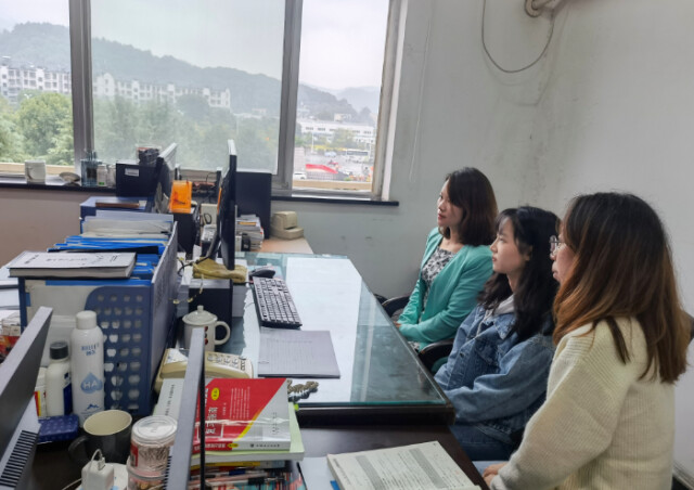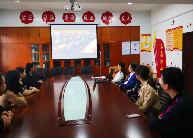 马克思主义学院教职工在会议室收看大会直播 贺诗琼/摄