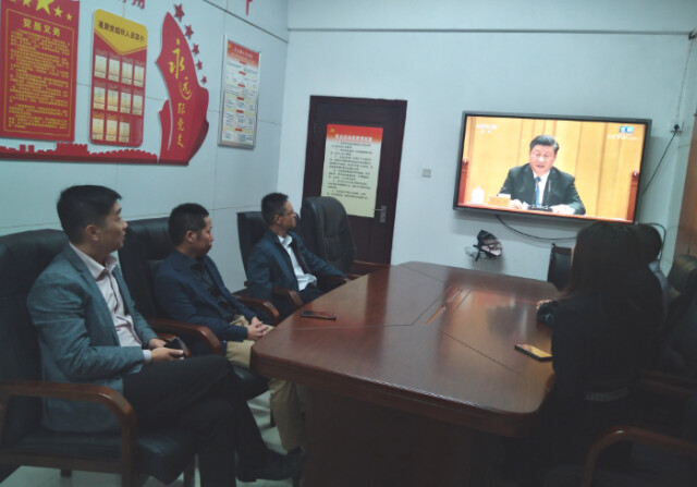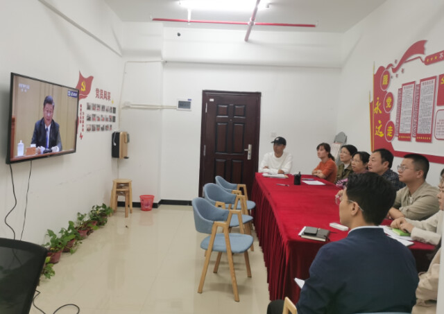 科研处教职工在会议室收看大会直播 周峰/供图