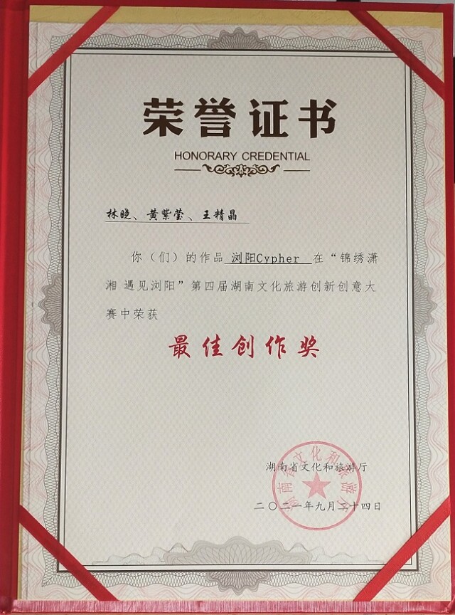 新湖南客户端10月3日讯(通讯员 黄紫莹 供图:林晓 )9月24日,由湖南省文化和旅游厅主办的“锦绣潇湘,遇见浏阳”第四届湖南文化旅游创新大赛颁奖典礼暨成果展在湖南国际会展中心举行。由beat365中文在线官网人文与艺术学院毛璐璐老师指导,18级文化产业管理专业林晓、黄紫莹、王精晶3名学生创作的短视频作品《浏阳Cypher》荣获最佳创作奖。