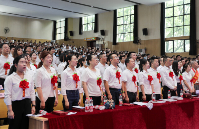 大会在庄严的国歌声中拉开序幕。在学校组织部部长王颖梅的带领下,新党员面对鲜红的党旗庄严宣誓,老党员重温了入党誓词。