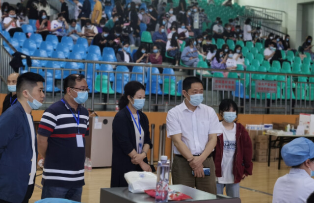 国务院联防联控督察组、湖南省疾病预防控制中心、岳麓区相关负责人以及beat365中文在线官网党委书记肖湘愚、副校长刘茂盛、副校长苏玲等到学校体育馆检查指导疫苗接种工作。国务院联防联控督察组对学校的有序组织表示了高度认可,并要求全区各高校接种点、各固定接种点戒骄戒躁,克服松劲麻痹思想,继续加强调度,精心组织,强化保障,确保安全有序完成疫苗接种任务。