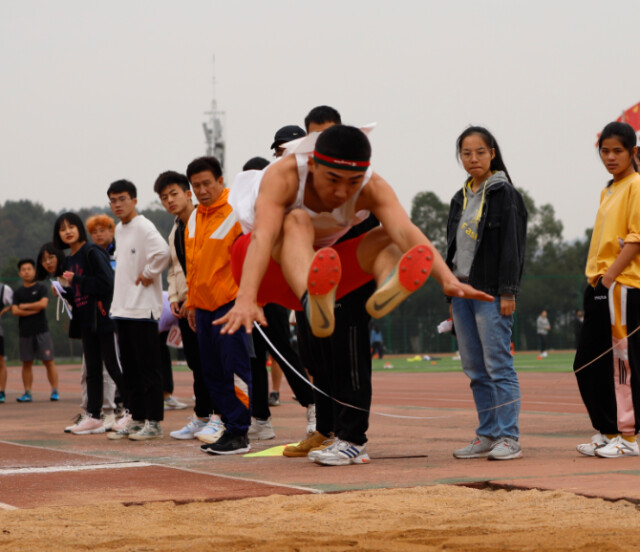当裁判员挥动旗子,跳远运动员摆起双臂,向前冲刺。到达白线关键点时,运动员猛地一跃,在空中完成了屈腿抬膝动作,两腿向前伸展,闪现一道完美的弧线,激起了尘沙飞扬。助跑、踏条、腾空、落地,一条条美丽的弧线、一个个轻捷的身影,从跳远赛场掠过。运动员在赛场上跳出了积攒了多年的力量,跃出了心中的梦想,全场观众皆为各运动员的出色发挥鼓掌称赞。最终,体育学院的杨远镇凭借11.79米的好成绩获得三级跳远比赛第一名。