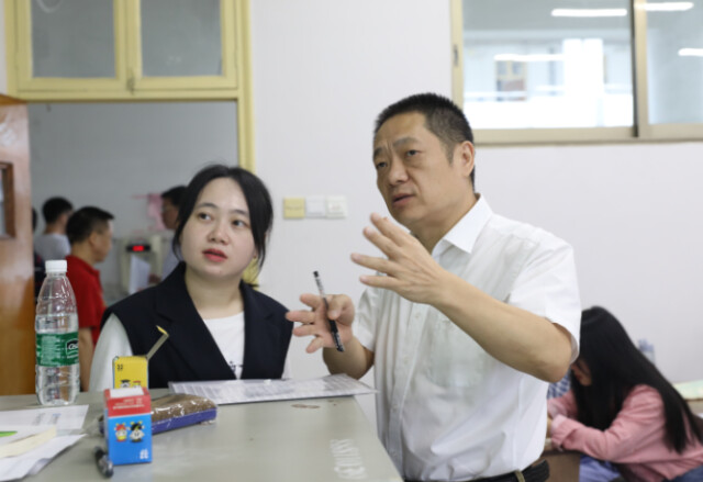 肖湘愚(右)与授课教师交流听课感受 何妍/摄
