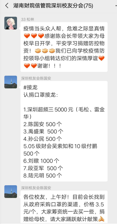 2月下旬,得知学校防控物资紧缺,湖南财院深圳校友会信管学院分会在负责人陈国安先生带领下积极行动,千方百计寻找货源,以最快速度为母校筹集防控物资,目前已筹得口罩10000余个、250支喷雾酒精、100瓶500ML免洗洗手液以及其他物资若干,该项工作还在继续,他们以实际行动支持母校防控工作。