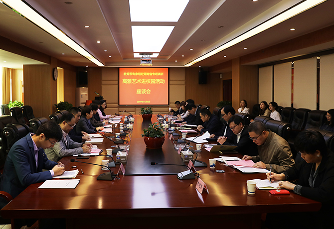 湖南日报·新湖南客户端11月6日讯(通讯员 何妍 摄影 汪洋)11月5日上午,由教育部艺术教育委员会副秘书长、中国艺术教育促进会秘书长曹瑛带领的教育部艺术教育调研组到湖南财院进行高雅艺术进校园活动专项调研。省教育厅体育卫生与艺术教育处处长彭四龙、调研员金彪、四级主任科员张志敏、艺术教育委员会秘书长刘大伟,湖南财院党委书记肖湘愚、副校长刘建民以及来自湖南第一师范学院、长沙师范学院、长沙民政职业技术学院、湖南城建职业技术学院等兄弟院校领导和师生参加座谈。
