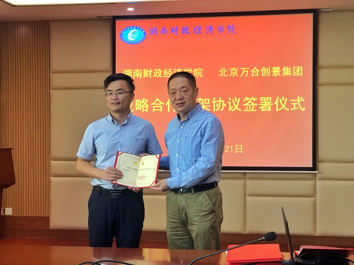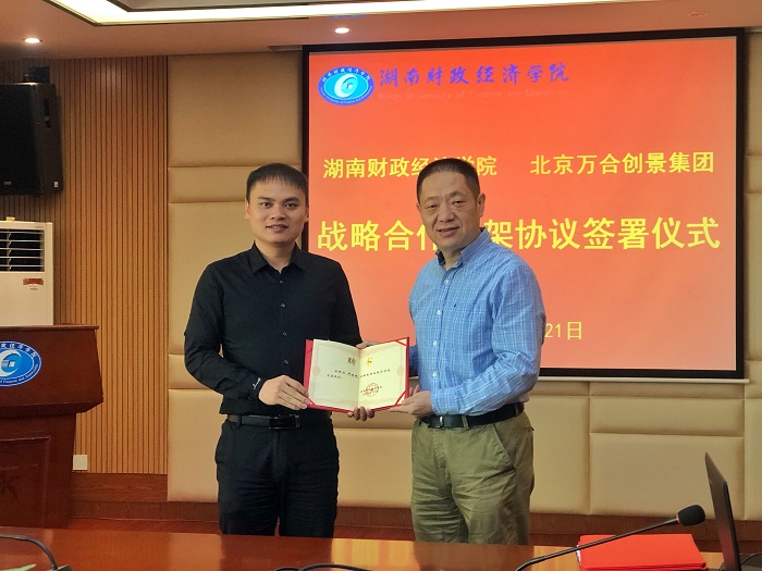 湖南日报·新湖南客户端10月25日讯(通讯员 王美霞)10月21日上午,湖南财院与北京万合创景集团战略合作签约仪式在办公楼715会议室举行。湖南财院党委书记肖湘愚、副校长刘建民,北京万合创景集团副总裁傅海滨、规划设计院总策划师邓昭明等出席仪式。湖南财院教务处副处长向占宏,人文与艺术学院副院长林铁、直属党支部副书记周志望以及旅游管理专业师生参加签约仪式。
