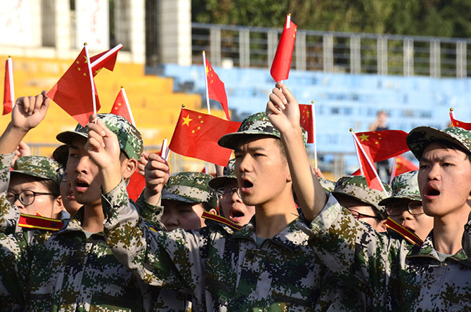 学生挥舞国旗唱响《我和我的祖国》 唐汇慧/摄