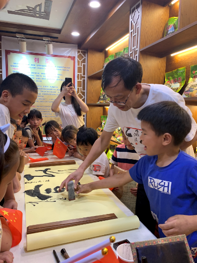 伍中信教授在教完孩子们书法以后,手把手教孩子学会铃印 陈玥/摄