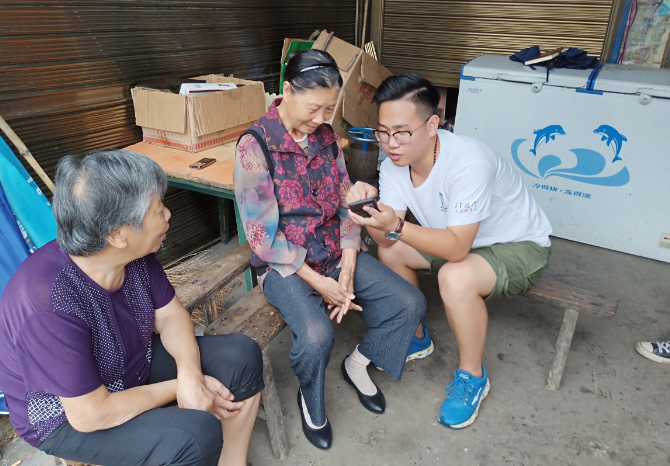 信息与技术管理学院IT益行队成员一对一教村民使用智能手机 苏晓彤/摄