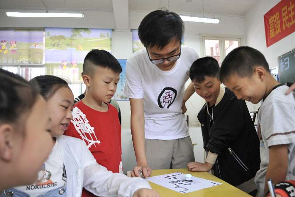 工商管理学院远辰志愿服务队在科普教育课堂上向孩子们展示XKBOT巡线机器人 马莹莹/摄
