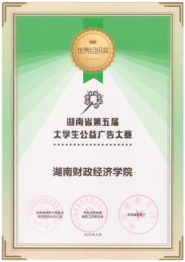湖南日报·新湖南客户端7月2日讯(通讯员 周雅)6月27日,湖南省第五届大学生公益广告大赛颁奖典礼在湖南大众传媒职业技术学院举行,湖南财院荣获大赛“优秀组织奖”,由徐晶老师指导人文与艺术学院2017级网络与新媒体一班吴越同学创作的《仁爱之心》荣获平面类网络人气奖。