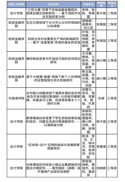 本届竞赛自今年3月份启动以来,经团队申报、各学校初评、资格审查和专家盲评等环节,共有来自全省36所本科高校共276件作品入围哲学社科类、自然科学类、科技发明制作类竞赛决赛。湖南财院推荐了经济类、管理类、社会调研等相关主题的参赛作品,经过文本评审、评委问辩等多个环节,作品《“三权分置”改革下农地金融发展现状、困境及模式创新研究——基于浏阳市试点实践探索为例》《生态文明视域下长沙市公众对环保税的认知调查》荣获竞赛二等奖,作品《财政分权对全要素生产率的影响研究——基于“省直管县”改革的准自然实验》《横向税收竞争对外溢性污染的空间效应研究》《基于大数据“画像”视角下新个人所得税的征管困境与优化机制研究》《乡村振兴战略视域下湘西非遗的活态传承及开发问题对策调研--以吉首市矮寨镇、凤凰县沱江镇、花垣县排碧乡十八洞村为例》《教育精准扶贫背景下学生资助政策实施的现状、问题及改进对策调查研究——以湖南省为例》《“区块链+会计”应用的挑战与发展前景调查研究》《长株潭地区科技型小微企业集群融资问题及对策研究——海凭国际(湖南)医疗器械产业园实地调研》荣获竞赛三等奖。