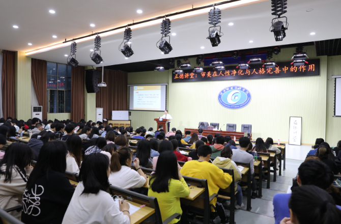 湖南日报·新湖南客户端5月20日讯(通讯员 唐雄伟 摄影 汪洋)“‘关关雎洲,在河之洲,窈窕淑女,君子好逑’……诗歌反映的美的世界比客观世界更完美,它能给审美者一种情感上的补偿,使其在缺陷的世界中找到完美的理想……”5月14日晚,湖南财院第八期正德讲堂在第二教学楼新阶三学术报告厅举行,国家教学名师、湘潭大学学术评价与发展委员会主任、博士生导师季水河教授受邀作主题为“审美在人性净化与人格完善中的作用”的讲座。三百余名师生聚精会神地跟随名师那旁征博引、深入浅出、生动有趣的讲授,感受了一次美的熏陶和心灵的洗礼。