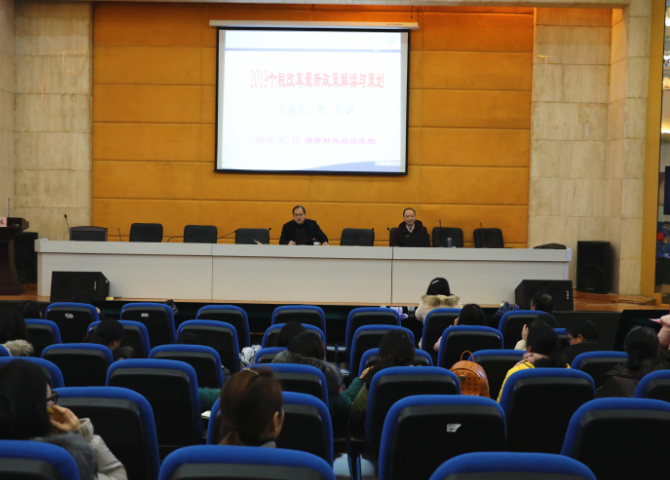 新湖南客户端1月15日讯(通讯员 李铁群 摄影 唐雄伟)为帮助广大教职员工全面了解个人所得税最新政策,便于教职工完成个人所得税专项附加扣除填报工作, 1月10日上午,湖南财院在图书馆四楼学术报告厅举办个人所得税最新政策解读与税收策划讲座,讲座由湖南财院财务处主办,由财务处处长李铁群主持,财政金融学院副教授贺飞跃担任主讲人。学校各部门、二级学院的教职工代表认真聆听了讲座。