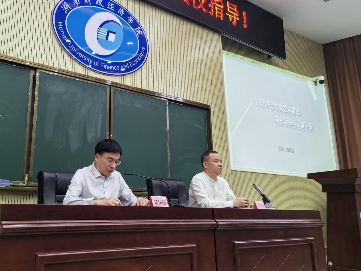 (本网讯)6月5日下午,由宣传统战部、教务处、人文与艺术学院、团委联合举办的美育大课堂在学校二教学楼2J02学术报告厅开讲。湖南美术馆馆长田绍登为师生讲授了一堂题为“从艺术创作到艺术管理:角色转换与价值平衡”的精彩讲座。讲座由副校长郭国强主持。