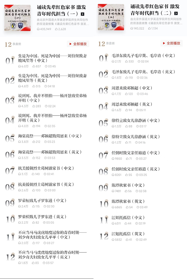 为深入推进学习贯彻习近平新时代中国特色社会主义思想主题教育,践行习近平总书记给北外老教授的重要回信精神,2023年5月,jinnianhui今年会党总支与“学习强国”学习平台联合推出外语诵读专栏《诵读先辈红色家书 激发青年时代担当》,为听众带来中英双语家书朗诵。朗读内容取材自十二篇家书,主题各异,涵盖反哺义、雎鸠缘、手足亲、舐犊情、至亲情等,重现了毛泽东、周恩来、杨开慧等中国先辈在不同时期闪耀的理想信念之光。5月22日和12月8日,两期共24条双语音频分别在“学期强国-强国之声-大学生朗读”频道正式上线,收获近55万播放量和千余条点赞量。