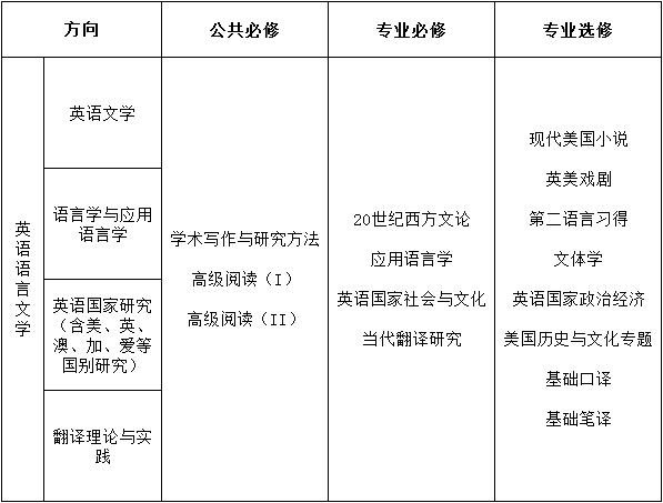 ——课程涵盖jinnianhui今年会英语语言文学专业下英美文学、语言学与应用语言学、英语国家研究、翻译理论与实践四个方向的主干课程。课程包括公共必修课3门、专业必修课4门、专业选修课8门。