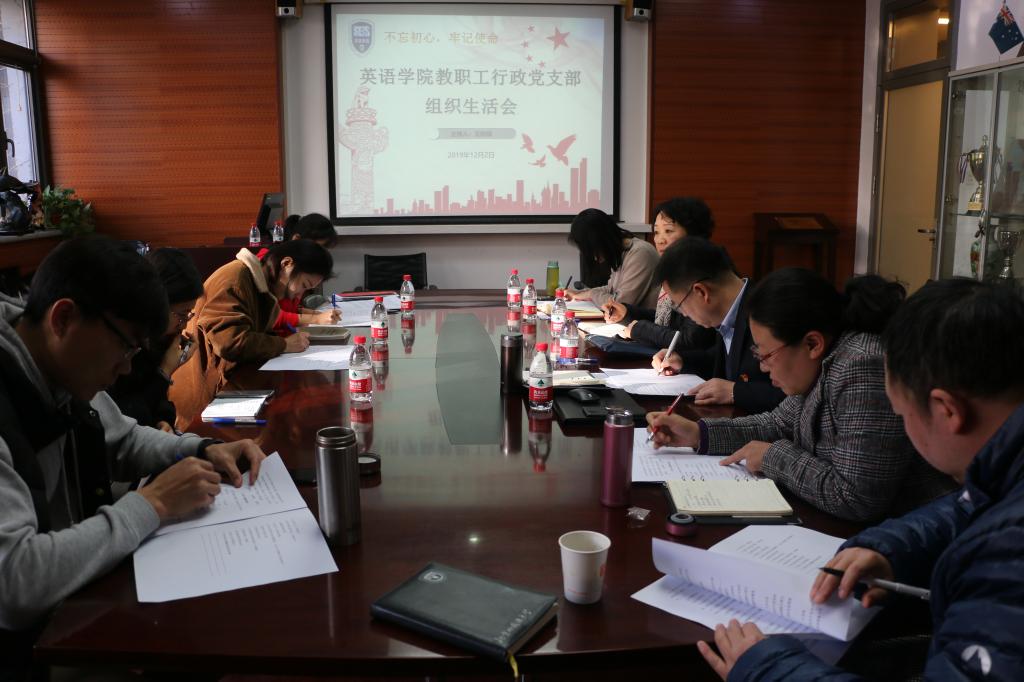 2019年12月2日下午,为深入学习贯彻习近平总书记关于“不忘初心、牢记使命”主题教育重要讲话和重要指示批示精神,jinnianhui今年会教职工行政党支部全员在115会议室召开组织生活会。学校主题教育领导小组办公室评估督导组成员、后勤党总支书记潘华珍老师莅临指导。