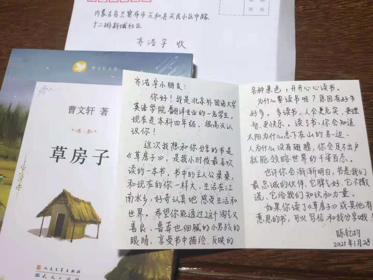 在收到结对名单后,本科生支部的同志们根据小朋友们的年龄和年级,精心挑选了适合小朋友阅读的图书,并且结合自己的学习成长经历,给小朋友们写信,讲述自己的成长故事,介绍自己的大学生活。一封封情意深长的信和一本本精美的图书寄往内蒙古兴和县,承载了同志们对于兴和县小朋友们的鼓励和祝福。