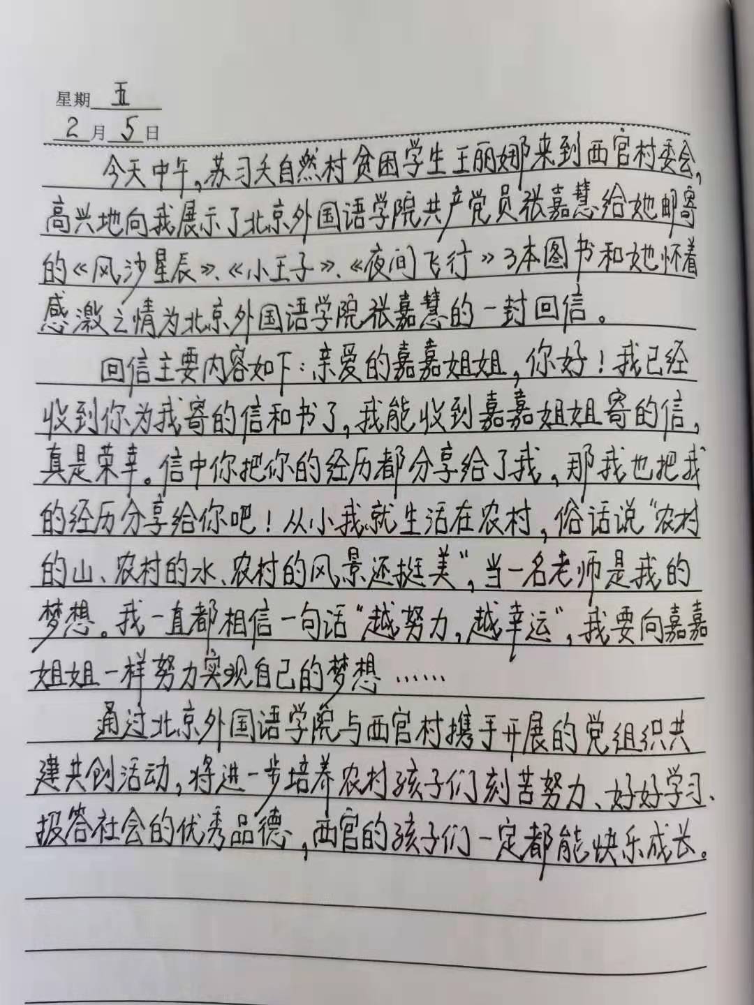 本次支部共建活动得到了西官村村委会和新城社区居委会的大力支持。西官村驻村第一书记王建平书记表示,西官村的大门永远向北外敞开,全力支持党组织共建活动。王建平书记在《驻村干部民情日记》中,对于本次活动进行了记录,并通过本科生党支部书记孙琳同志向参与共建活动的同志们表达了感谢。