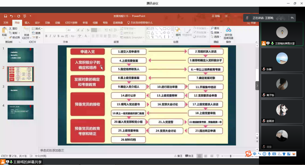 首先,王丽瑶同志对于党员发展流程进行了介绍,对于每一项流程的具体要求进行了细致的讲解,并特别强调了思想汇报书写与提交的相关注意事项,要求发展对象结合学习、工作与生活情况,主动向党组织反映自己的真实想法。