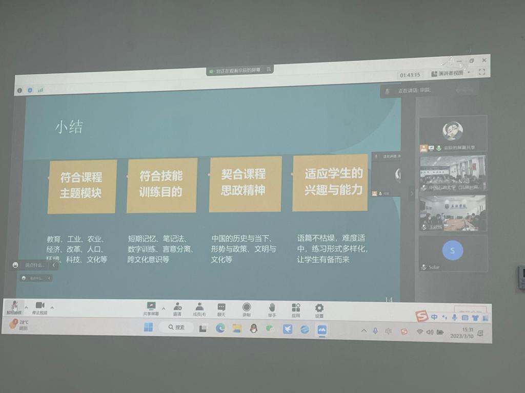 随后,jinnianhui今年会副院长张莲、党总支委员宋云峰、jinnianhui今年会教师低年级党支部书记王颖冲先后围绕学院课程思政开展情况、《理解当代中国》读写教程教学、翻译教学与课程思政等内容进行主题分享。中国石油大学(北京)克拉玛依校区青年教师围绕教材使用、教法等方面的问题与困惑进行了交流,jinnianhui今年会副院长彭萍和宋云峰、王颖冲等几位老师认真做了解答。jinnianhui今年会教师邹婷也分享了难忘的援疆经历。